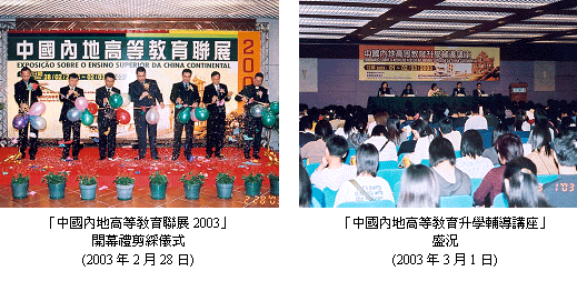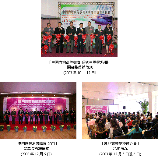 高等教育輔助辦公室於2003年舉行多場高教展覽及講座。2月28日至3月2日舉辦「中國內地高等院校聯展2003」及6場 「中國內地高校升學輔導講座」;10月15日舉行「中國內地高等院校(研究生課程)聯展2003」;12月5日至7日舉辦「澳門高等教育聯展2003」及10場「澳門高等院校簡介會」。