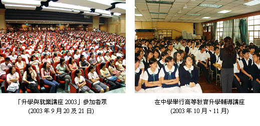 2003年度高等教育輔助辦公室舉辦了兩場「升學與就業」講座(9月20日及21日),出席者達2,500人次。另外,為更全面向本澳應屆中學畢業生提供升學輔導,2003年10月至11月期間,高教辦安排輔導員到本澳30所中學舉行了32場高等教育升學輔導講座,參加人數達5,386人。