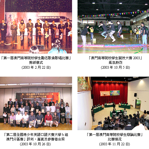 (七)高等院校校際活動 為豐富本澳高等院校學生的課餘生活,高等教育輔助辦公室於2003年舉辦了「第一屆澳門高等院校學生勵志歌曲歌唱比賽」(2月22日)、「澳門高等院校學生競技大賽2003」(10月5日)、「第二屆全國青少年英語口語大賽大學b組澳門分區賽」(10月26日)及「第一屆澳門高等院校學生辯論比賽」(11月22日及30日),4個活動參加人數超過1,000人次。